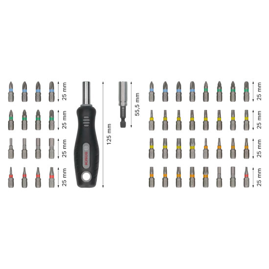 Opis seta Bit izvijača od 25 mm: PH1 (2x), PH2 (4x), PH3 (2x), PZ1 (2x), PZ2 (4x), PZ3 (2x), T10, T15 (2x), T20 (3x), T25 (3x), T27, T30, T40, T10H, T15H, T20H (2x), T25H (2x), T27H, T30H, T40H, H3, H4 (2x), H5 (2x), H6, SL3, SL4, SL5 (2x), SL6. Držač bitova od 55 mm: standardni držač bitova. Drška izvijača: drška izvijača od 125 mm.