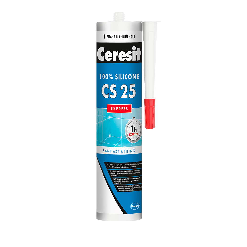 CERESIT® CS 25 EXPRESS brzovezujući je, jednokomponentni sanitarni silikon koji očvršćava kada je izložen vlazi. Tipična područja primjene: brtvljenje spojnih i dilatacijskih fuga s hladnom oblogom u kupaonicama, vlažnim prostorijama, pri izradi obloga stepenica i postolja - gdje je potrebno kratko vrijeme sušenja i dugotrajna zaštita od plijesni. Stvrdnjava octenom kiselinom, pa se ne može koristiti za brtvljenje metalnih površina ili građevinskih materijala koji sadrže cement i vapno.