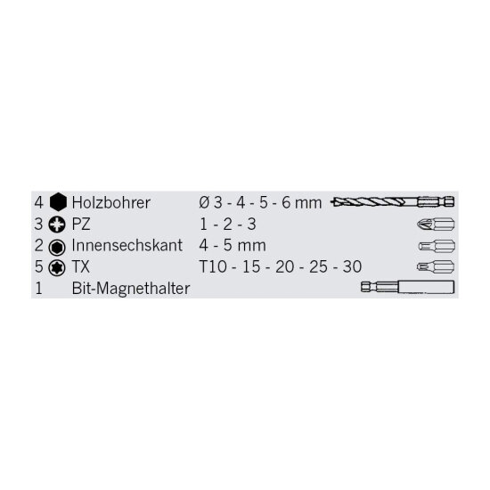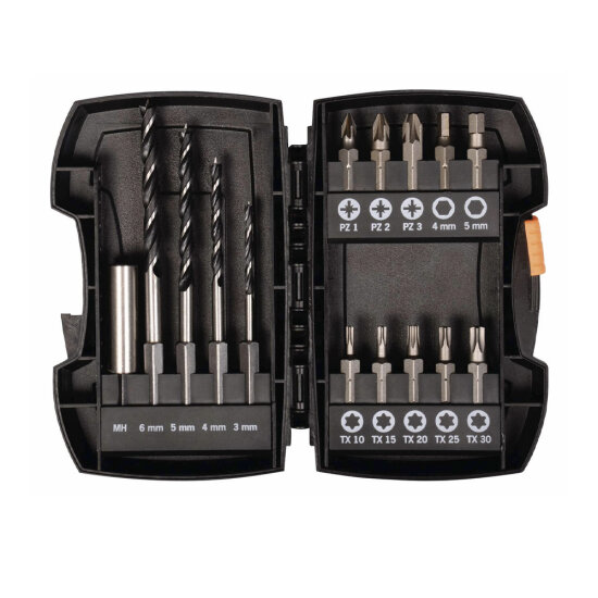Set od 15 svrdala za drvo s prihvatom E 6.3, Ø 3, 4, 5, 6 mm Bitovi: PZ, TX, Hex. Visokokvalitetna svrdla za drvo; prihvat i spirala svrdla izrađeni su od punog materijala Idealno za aku-odvijače zahvaljujući posebnom 6-stranom prihvatu od 1/4" (E 6.3) Oštar vrh svrdla za centriranje za precizno bušenje. Za bušenje mekog drva, šperploče, iverice i plastike. Sadržaj: Svrdla za drvo: Ø 3 - 4 - 5 - 6 mm Bitovi: PZ 1 - 2 - 3, Hex 4 - 5 TX 10 - 15 - 20 - 25 - 30 Uključuje magnetski držač bitova.