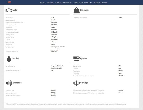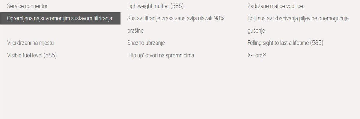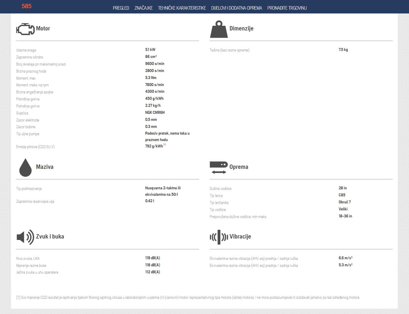 Husqvarna 585 razvijena je za profesionalce i one korisnike koji zahtijevaju najbolje performanse u najzahtjevnijim uvjetima. Ovu motornu pilu ističe pouzdan rad i dobro uravnotežena upravljivost. Zahvaljujući AutoTune 3.0, ova motorna pila lako se pokreće i radi optimalno u svim uvjetima. Snažni X-Torq motor u kombinaciji s lancima X-Cut C85 / C83 pruža najbolji omjer snage i težine. Opremljena najnovijim i izuzetno izdržljivim vodilicama X-Tough ™ ili X-Tough ™ Light dostupnima u dužinama od 51 do 91 cm.