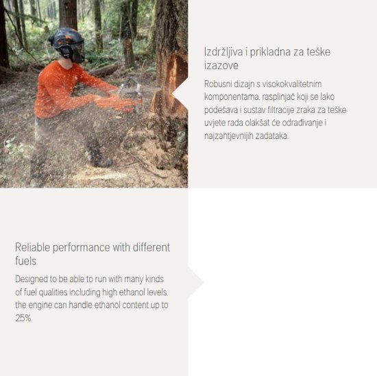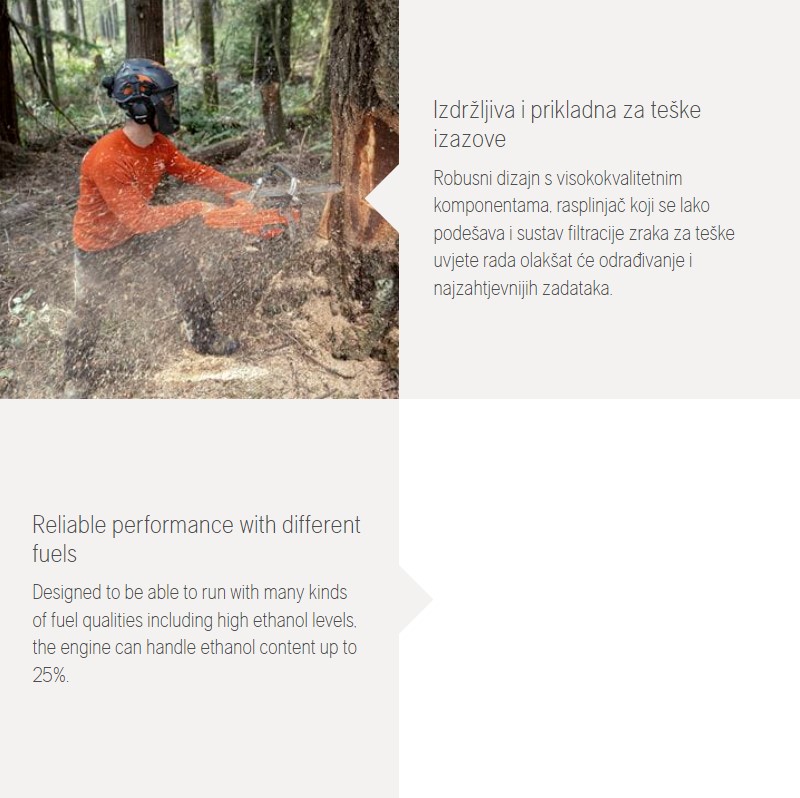 Robusni dizajn s visokokvalitetnim komponentama, rasplinjač koji se lako podešava i sustav filtracije zraka za teške uvjete rada olakšat će odrađivanje i najzahtjevnijih zadataka.