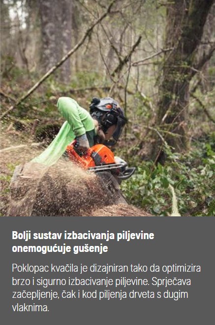 Poklopac kvačila je dizajniran tako da optimizira brzo i sigurno izbacivanje piljevine. Sprječava začepljenje, čak i kod piljenja drveta s dugim vlaknima.