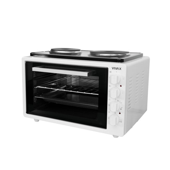 Vrata pećnice imaju dvostruko staklo i metalnu ručku. Standardna oprema VIVAX mini pećnice MO-4201 White uključuje plitku posuda za pečenje i rešetkastu policu.